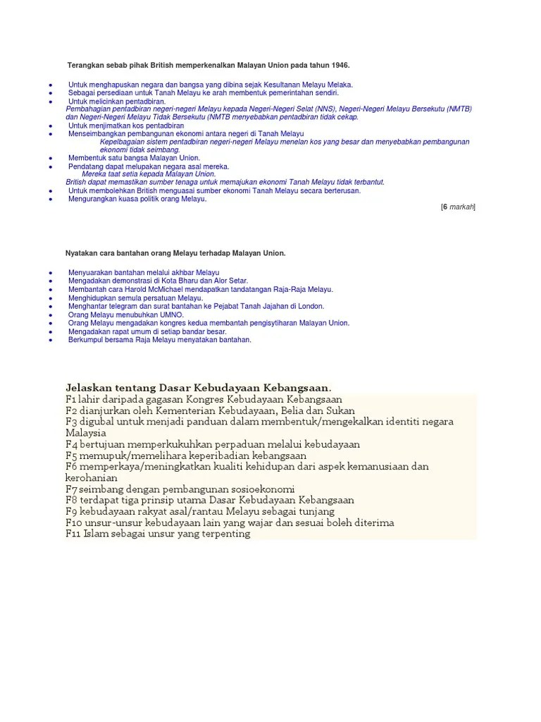 Ciri Ciri Malayan Union Esei / Ciri Ciri Perlembagaan Tanah Melayu Pdf. Bahagian b (esei) soalan cadangan pp markah 1 1 (a) f1 mengapakah masyarakat tempatan menetang penyerahan tersebut ? Baca versi flipbook dari cara menulis esei sejarah dan kemusykilan yang dihadapi para pelajar. 1 1 f2 dipaksa menerima penjajahan british secara mutlak 1 1 keturunan james brooke menyerahkan sarawak kepada kerajaan british 4 m f3 di london sebagai tanah jajahan mahkota 1 mereka …